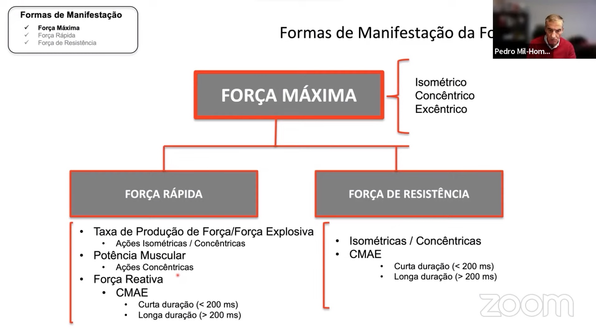 Depois da sessão introdutória, gravada previamente e disponível no canal de Youtube do COP , Pedro Mil-Homens abordou, entre outros assuntos, a força máxima e força rápida, a taxa de produção de força e o aumento da potência.