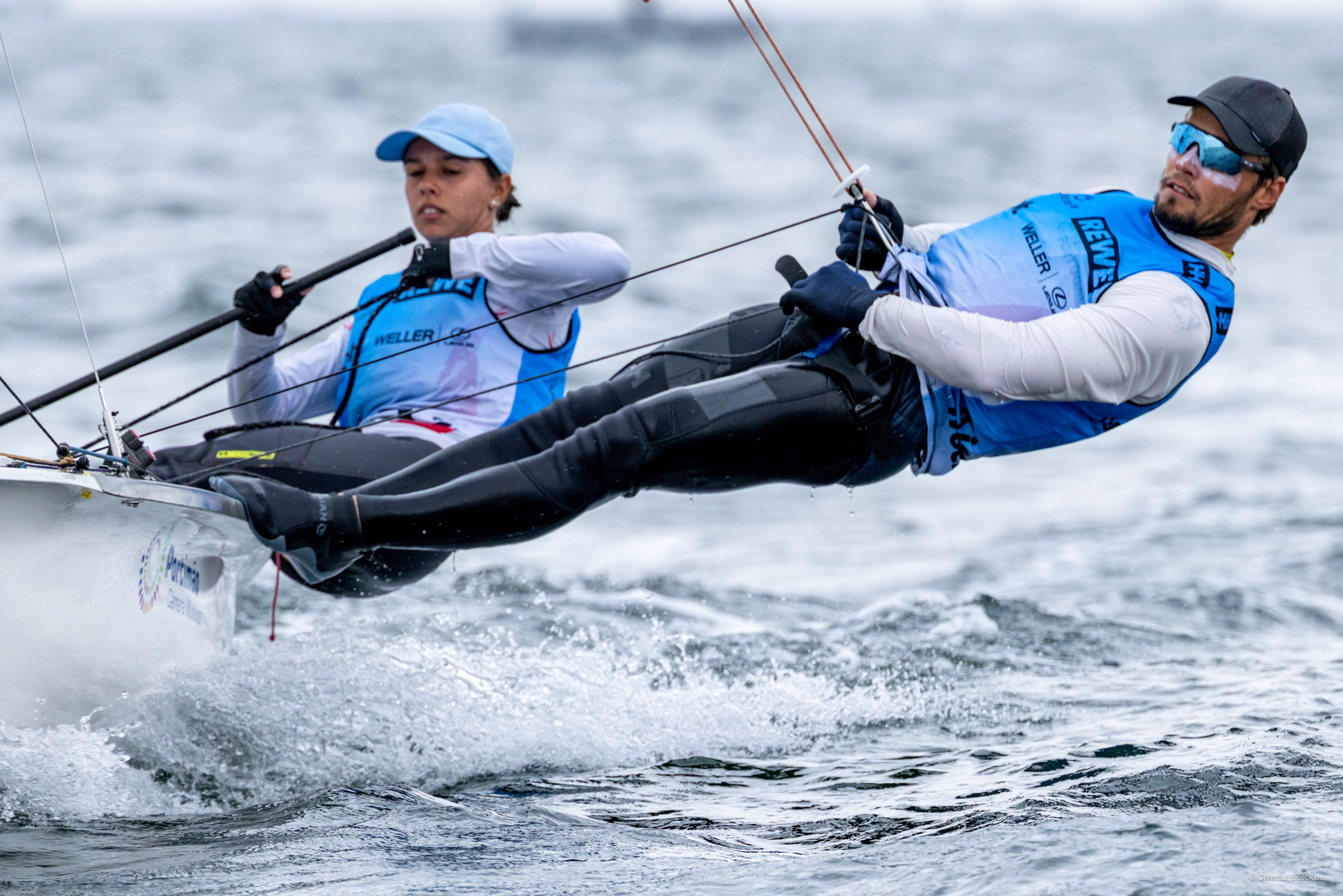 Diogo Costa e Carolina João mantiveram o 3.º lugar, apesar de inicialmente terem sido dados como 4.ºs, em igualdade pontual (22) com os espanhóis campeões do Mundo, Jordi Xammar e Marta Alcántara. Os velejadores portugueses terminaram as duas regatas do dia na 4.ª (e não no 5.º lugar) e na 6.ª posição e somam 21 pontos “net”.