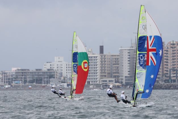 Faltam ainda completar três regatas amanhã, antes do acesso à medal race, mas por agora os velejadores portugueses têm 73 pontos (53 pontos "net"). Na liderança continua a dupla britânica Dylan Fletcher e Stuart Bithell, com 50 pontos (34 "net").