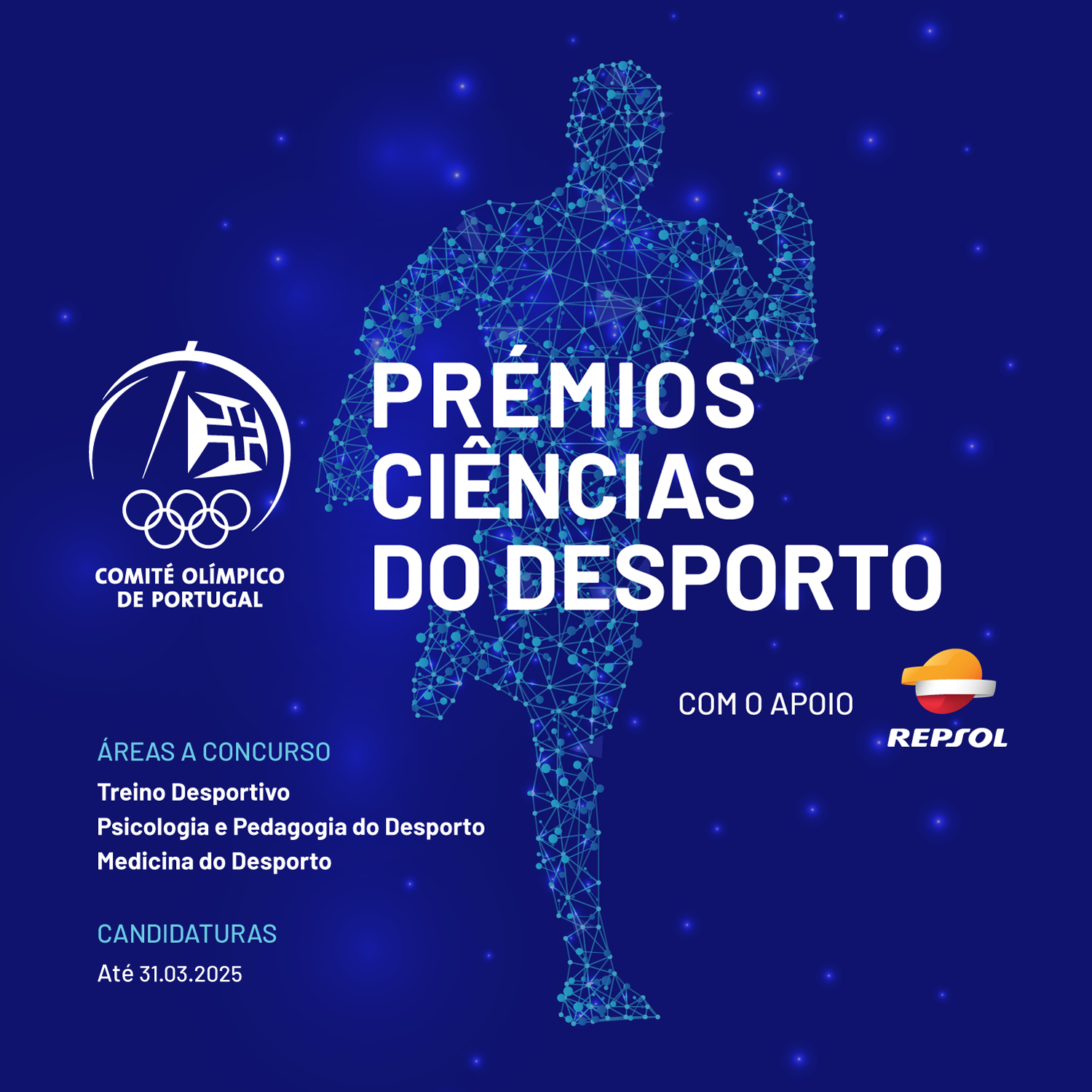 As candidaturas aos Prémios Ciências do Desporto COP | REPSOL 2025 estão abertas até 31 de março de 2025 nas áreas de Treino Desportivo, Psicologia e Pedagogia do Desporto, e Medicina do Desporto.
