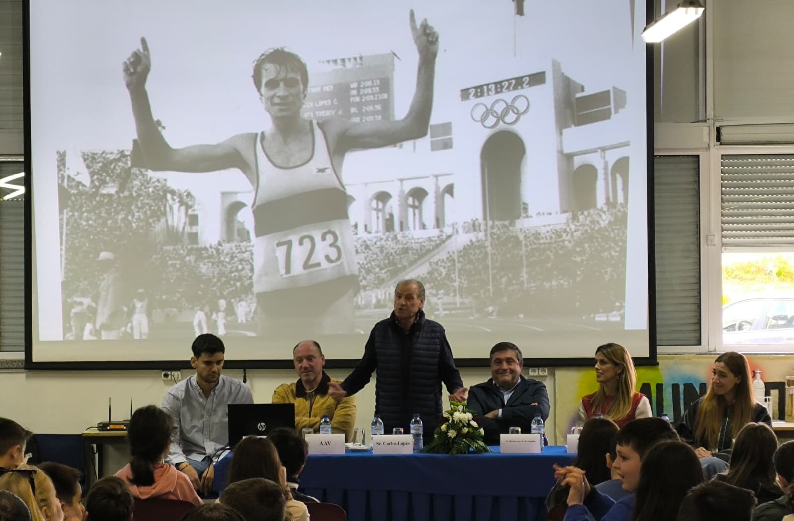 Durante a sessão, os alunos do 2.º ciclo deste Agrupamento tiveram oportunidade de conhecer mais de perto o percurso desportivo de Carlos Lopes, o primeiro Campeão Olímpico português. Carlos Lopes conquistou a medalha de prata nos 10 000 metros nos Jogos Olímpicos Montreal 1976 e a medalha de ouro na maratona nos Jogos Olímpicos Los Angeles 1984, tendo ainda representado Portugal nos Jogos Olímpicos Munique 1972. No final da atividade, os alunos foram convidados a avaliar a sessão através de uma dinâmica participativa: cada um colocou medalhas num pódio simbólico, identificando os momentos de que mais gostaram e sugerindo melhorias para futuras iniciativas.