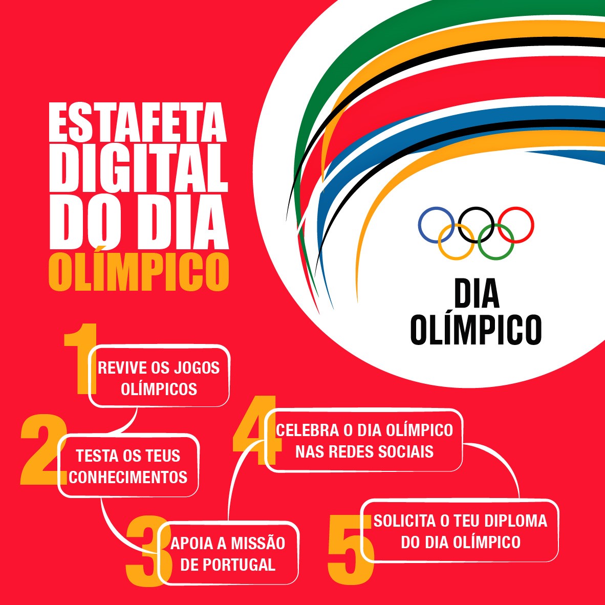 Desafio dirigido a todos os interessados pelo Movimento Olímpico composto por cinco atividades, que deverão ser realizadas entre 19 e 27 de junho. Ao longo destas cinco etapas os participantes são desafiados a reviver um momento marcante dos Jogos Olímpicos, a testar os seus conhecimentos, a apoiar a Missão de Portugal que estará presente nos Jogos Olímpicos de Tóquio e a celebrar o Dia Olímpico, concluindo a sua participação com a solicitação do Diploma de Participação.