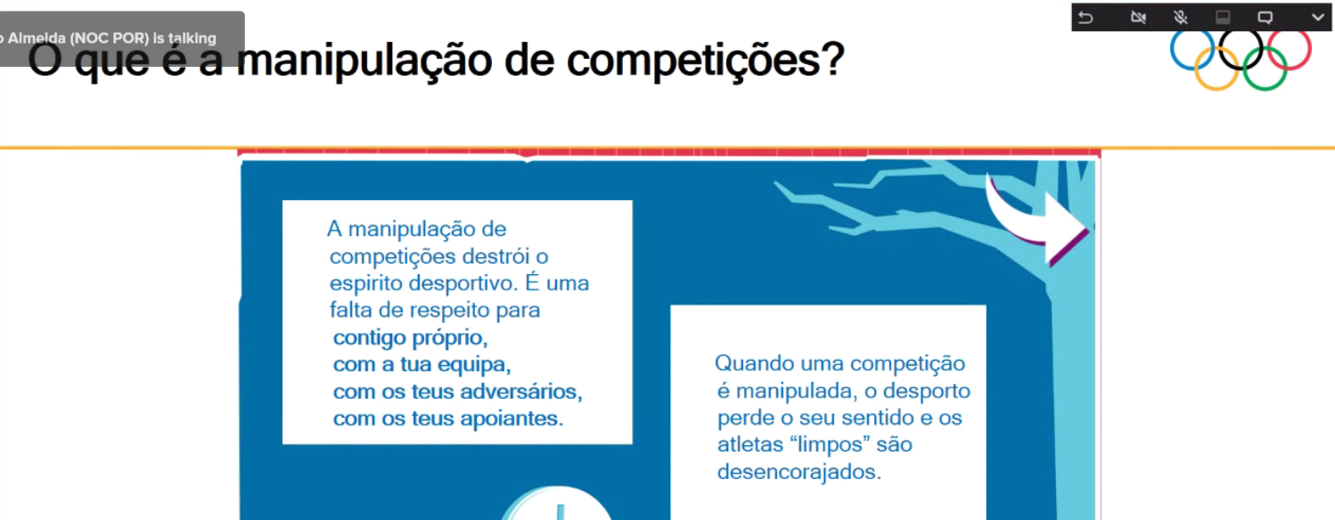 João Paulo Almeida, diretor-geral do COP, esclareceu que o webinar visou “aumentar a sensibilização para o tema da manipulação de competições”, um fenómeno tipificado na Convenção do Conselho da Europa, que Portugal há muito ratificou. “Deixamos de competir de acordo com as normas para perdermos intencionalmente”, explicou, para acrescentar: “A manipulação de competições destrói o espírito desportivo.”