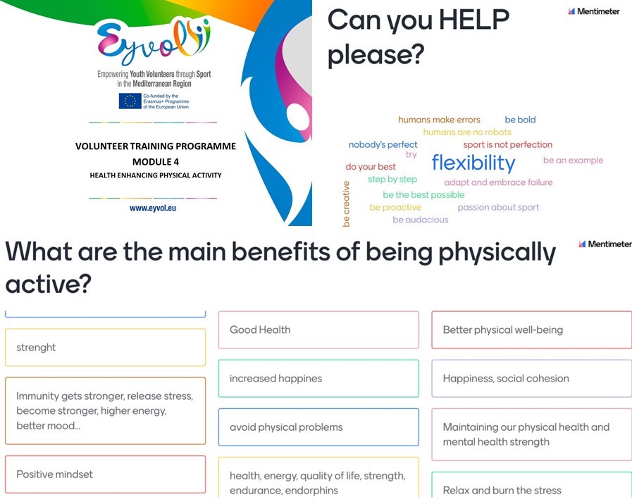 Os conteúdos do programa de formação , divididos em dois blocos temáticos, nomeadamente: 1) “promoção da saúde através da atividade física” e 2) “o papel do desporto na promoção da saúde física e mental” foram administrados sob forma de partilha de experiências e criação de dinâmicas de interação, com vista a desenvolver e aprofundar conhecimentos no domínio do voluntariado no desporto relacionado com a mudança comportamental e a inclusão social.