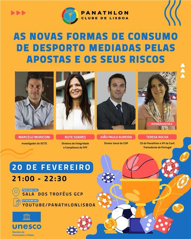 O diretor-geral do Comité Olímpico de Portugal, João Paulo Almeida, participará na conferência "As novas formas de consumo de Desporto mediadas pelas apostas e os seus riscos", organizada pelo Panathlon Clube de Lisboa e pelo Clube para a UNESCO Pelos Valores Desportivos.