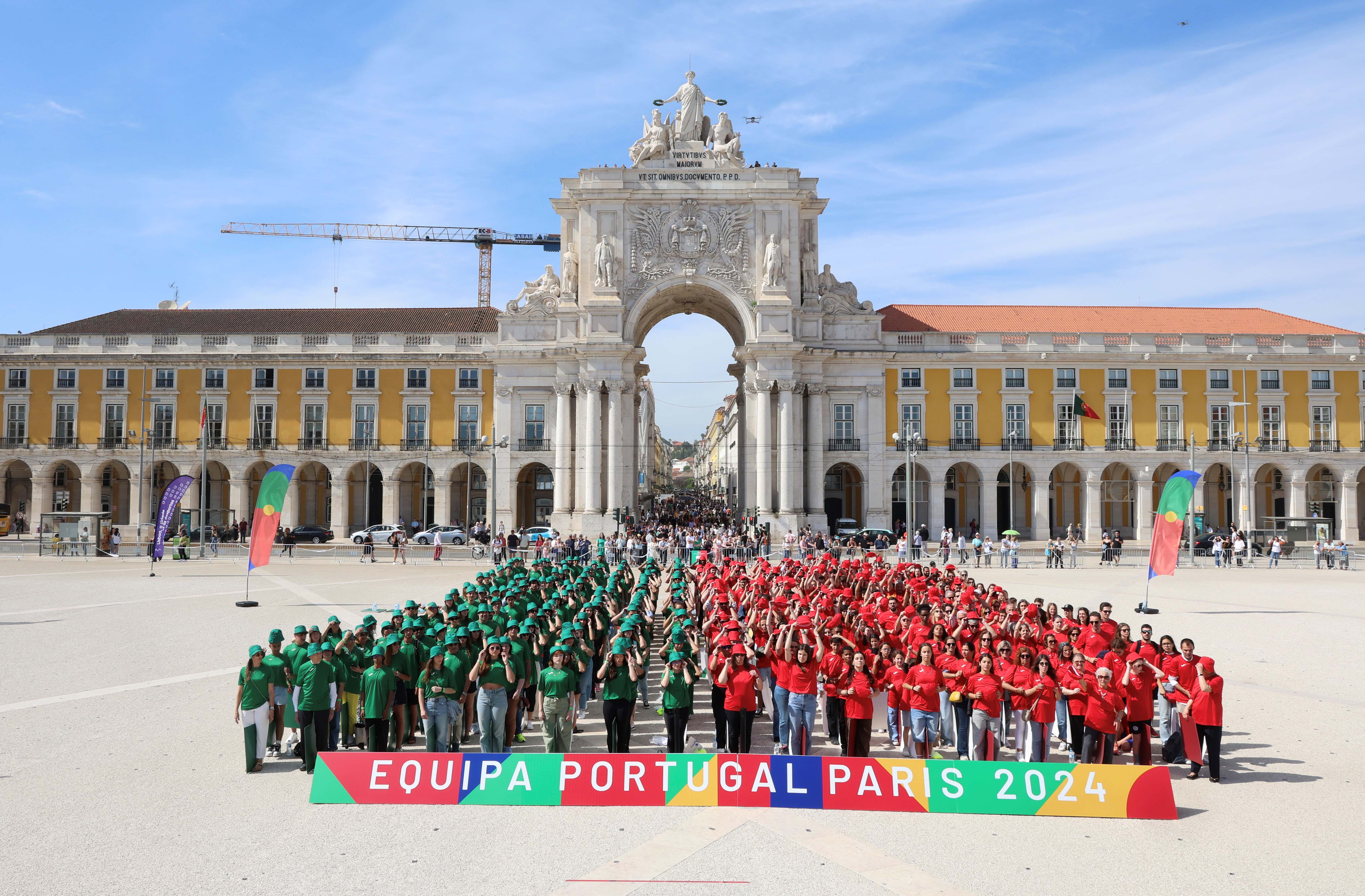Dezenas de voluntários reuniram-se na Praça do Comércio, em Lisboa, vestindo uns de vermelho, outros de verde, para formarem a Bandeira Nacional, dando testemunho da sua ligação à Equipa Portugal que estará em Paris 2024, de 26 julho a 11 de agosto.