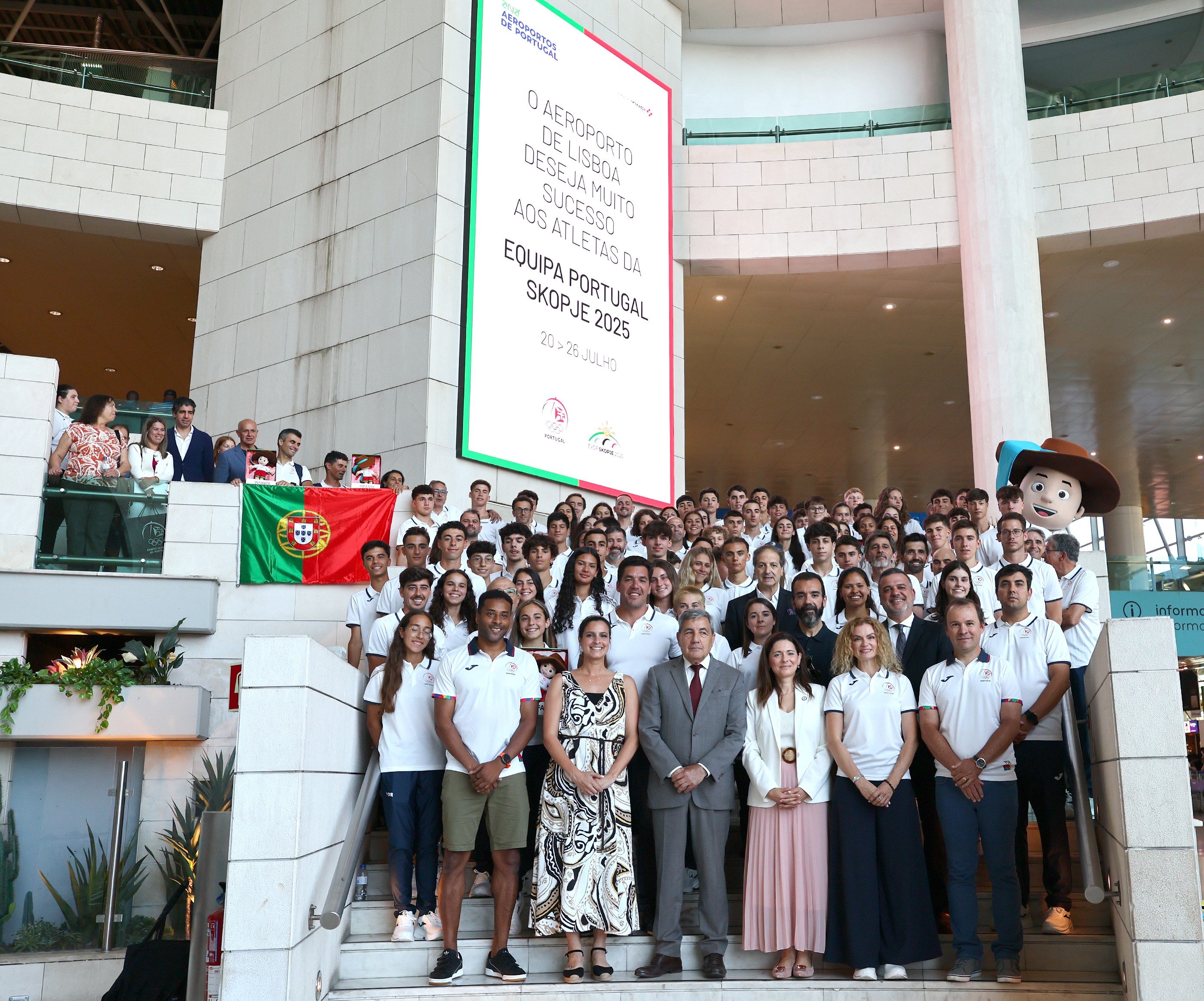 Horas antes da partida, este sábado, no Aeroporto de Lisboa, inspirada por Nelson Évora, Sérgio Paulinho e Fernando Pimenta, atletas com medalhas conquistadas em Jogos Olímpicos e também no FOJE, nomeados embaixadores junto dos jovens atletas, a Equipa Portugal recebeu simbolicamente, disciplina a disciplina, a Bandeira Nacional que transportará até à Macedónia do Norte.