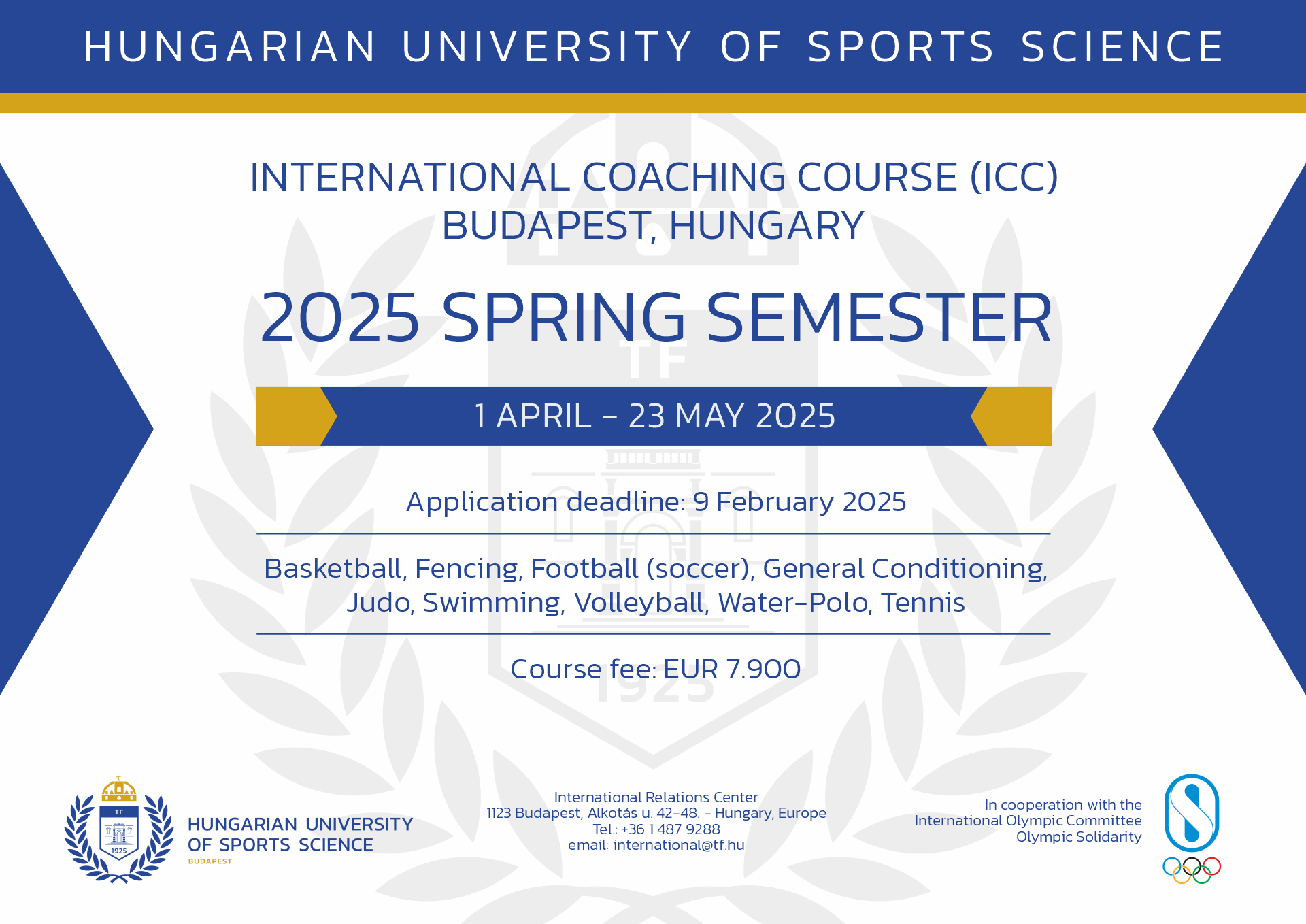 O International Coaching Course é apoiado pela Solidariedade Olímpica, que concede bolsas de estudo para treinadores interessados, estando o prazo para apresentação de candidaturas a decorrer até 9 de fevereiro. Os requisitos necessários estão disponíveis no link https://tf.hu/en/students/future-students/international-coaching-course e informações adicionais sobre o programa podem ser consultadas em https://apply.tf.hu/courses/course/14-international-coaching-course .