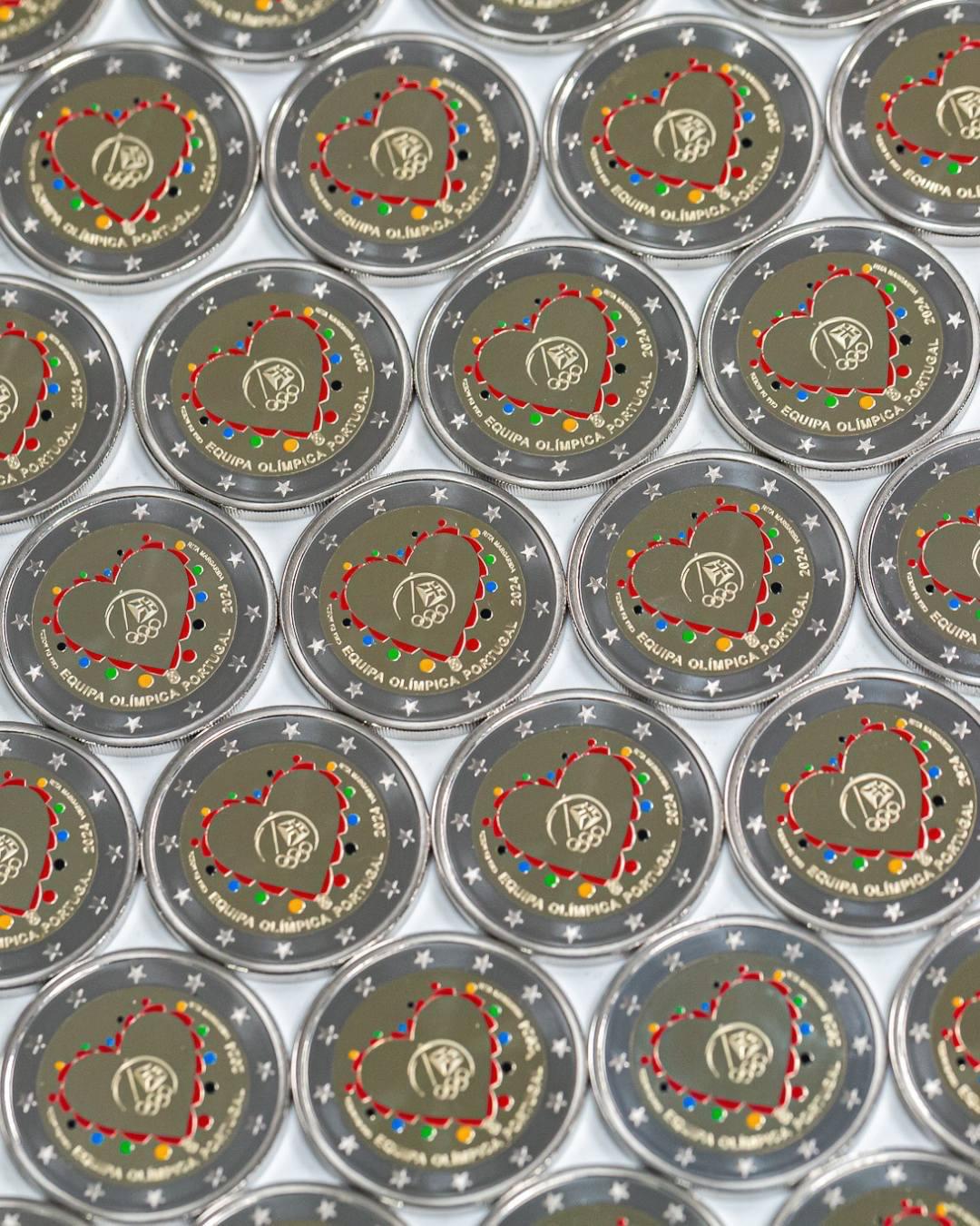 A moeda comemorativa da participação da Equipa Portugal em Paris 2024 tem o valor facial de 2,00 €, tendo sido cunhados 500 000 exemplares, mais 10 mil exemplares com acabamento especial BNC (ao preço de 10,00 € cada) e 10 mil unidades com acabamento especial proof, estas últimas com inserção de cor (23,00 € a unidade). O coração é o elemento central da moeda e a versão “proof" tem destaques coloridos com as cores dos anéis olímpicos e o símbolo do COP, evocativo das Descobertas.