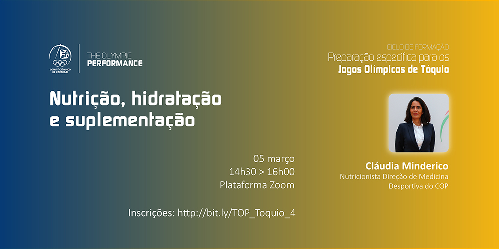 Sexta-feira é dia de mais uma sessão do ciclo de formação promovido pelo programa "The Olympic Performance" do Comité Olímpico de Portugal (COP), relacionado com a preparação específica para os Jogos Olímpicos Tóquio 2020 e desta vez o tema em destaque é a nutrição. Esta sessão será dirigida pela nutricionista da Direção de Medicina Desportiva do Comité Olímpico de Portugal, Cláudia Minderico e decorre no dia 5 de março, entre as 14h30 e as 16h00 na plataforma Zoom. As inscrições são gratuitas e já estão a decorrer aqui .