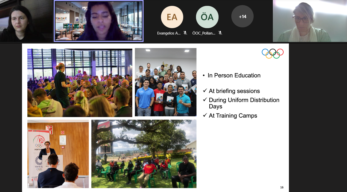 Joana Gonçalves, gestora de projeto e responsável pela unidade de integridade do COP, foi a oradora convidada pelo Comité Olímpico Internacional (COI) a partilhar o modelo de trabalho adotado pelo COP no percurso para Tóquio 2020, dando especial enfoque aos principais desafios e soluções, e ainda algumas recomendações e boas práticas a adotar pelos CONs neste domínio.