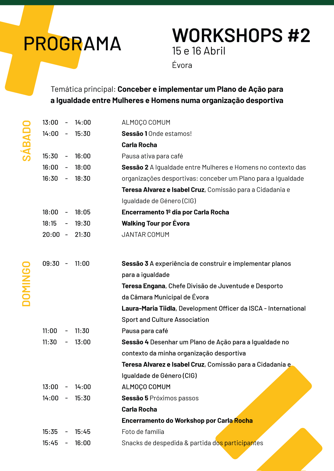 Desta vez a temática principal centra-se na conceção e implementação de um plano de ação para a igualdade entre mulheres e homens numa organização desportiva. O programa inicia-se com as boas-vindas pela moderadora e dinamizadora Carla Rocha, seguindo das intervenções de Teresa Alvarez e Isabel Cruz, da Comissão para a Cidadania e Igualdade de Género, que irão dotar os formandos de ferramentas para efetivar um plano para a igualdade nas suas organizações desportivas.