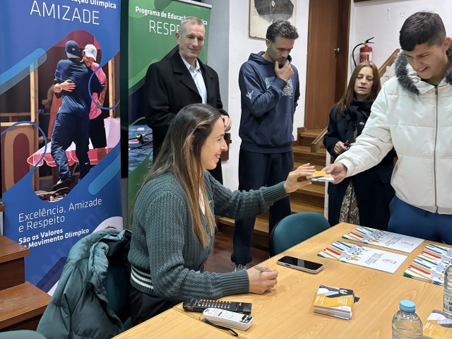 Antes de passar ao momento de assinar os postais do Programa de Educação Olímpica para oferecer aos alunos e professores, Sara Catarina Ribeiro reforçou a sua mensagem: "Para atingirmos os nossos objetivos temos de ser capazes de superar diversos obstáculos e dificuldades que nos surgem pelo caminho."