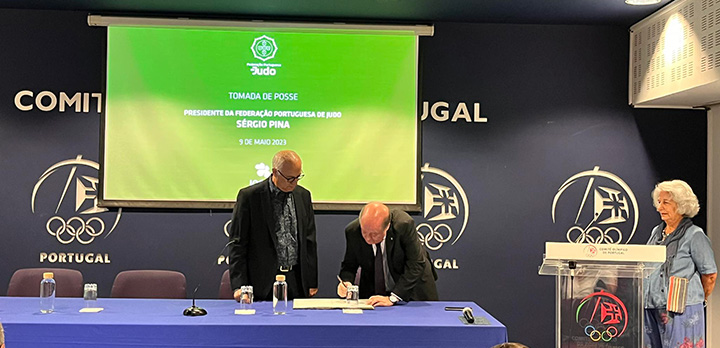 O Auditório do Comité Olímpico de Portugal (COP) recebeu hoje a sessão de tomada de posse do Presidente da Federação Portuguesa de Judo (FPJ), Sérgio Pina. Na sequência do ato eleitoral intercalar de 29 de abril, Carlos Andrade, Presidente da Assembleia Geral da FPF, deu posse a Sérgio Pina para o mandato que se prolonga até ao final do ciclo Olímpico Paris 2024. “Estou convicto que estamos em condições de normalizar a vida interna da FPJ”, referiu Carlos Andrade após o ato de posse. “É em si que depositamos a esperança e a confiança para levar a bom porto esta nau que é o Judo português”.