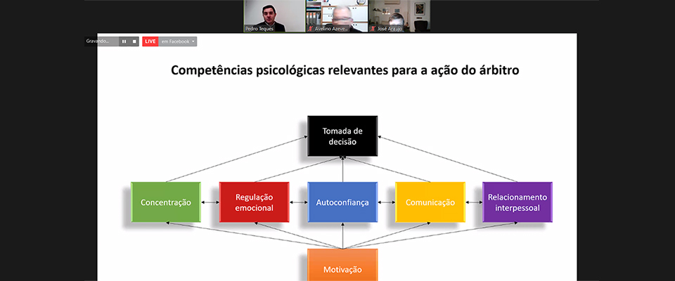Especialista em Psicologia do Desporto, colaborador do Conselho de Arbitragem da Federação Portuguesa de Futebol, Pedro Teques começou por abordar o pós-competição do árbitro, numa sessão moderada por Avelino Azevedo, membro da CAAD do COP.