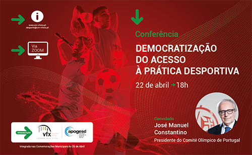 A Câmara Municipal de Vila Franca de Xira organiza no dia 22 de abril uma conferência sobre “A Democratização do Acesso à Prática Desportiva”. A iniciativa, que decorre entre as 18h00 e as 19h00 em formato videoconferência, irá ter como orador convidado o Presidente do Comité Olímpico de Portugal, José Manuel Constantino.